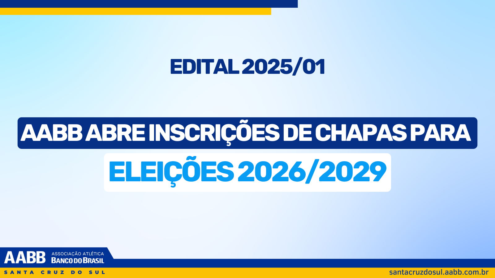 A AABB Santa Cruz do Sul informa que, entre os dias 13 de outubro e 12 de novembro de 2025, estão abertas as inscrições de chapas para as eleições dos Conselhos de Administração, Deliberativo e Fiscal, referentes ao mandato 2026/2029.