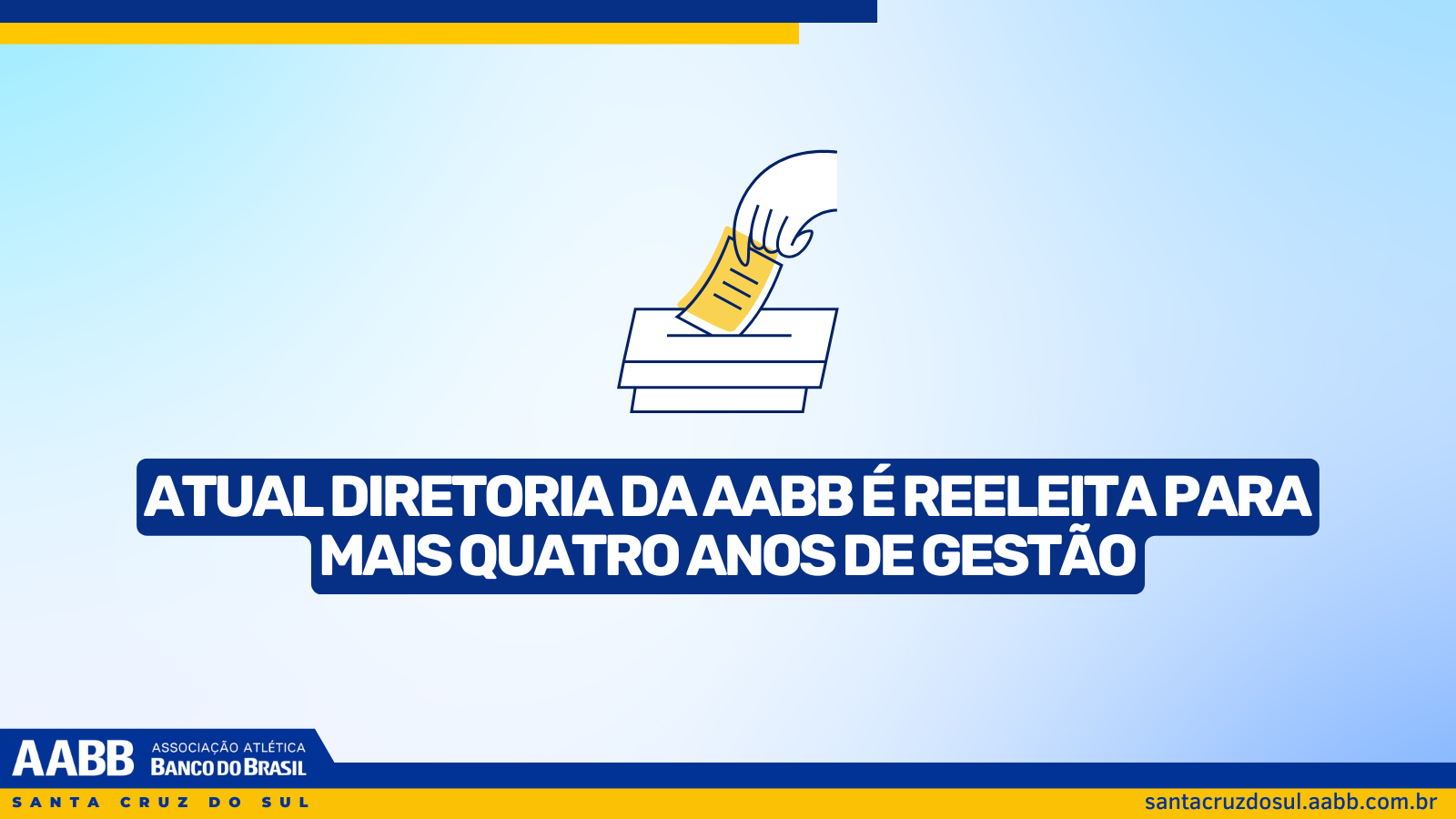 A Associação Atlética Banco do Brasil — AABB Santa Cruz do Sul realizou, no sábado, 22 de novembro, a eleição para escolha da diretoria que estará à frente do clube no quadriênio 2026/2029. O pleito ocorreu presencialmente, na sede, das 13h às 17h, com votação exclusiva para sócios titulares, em pleno exercício dos seus direitos