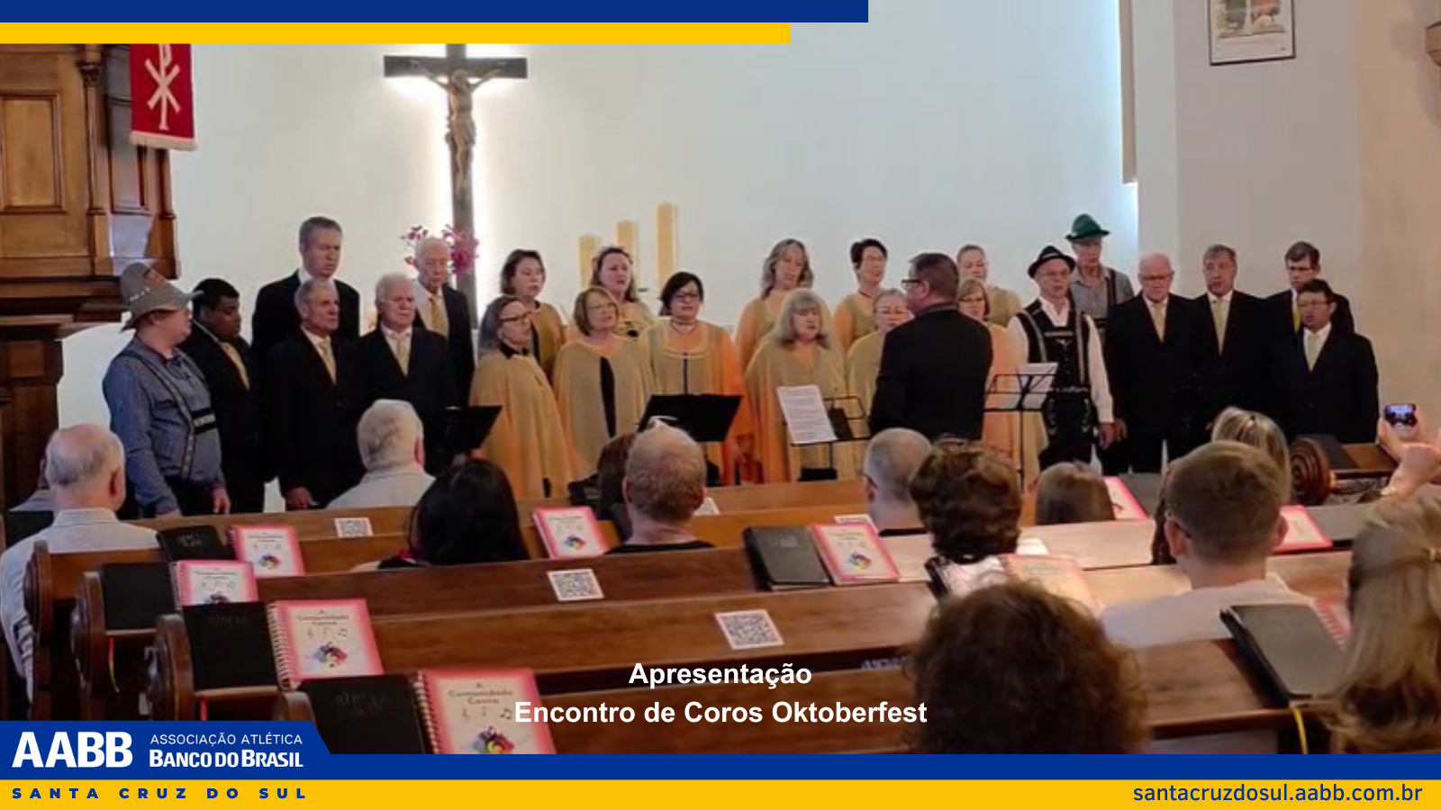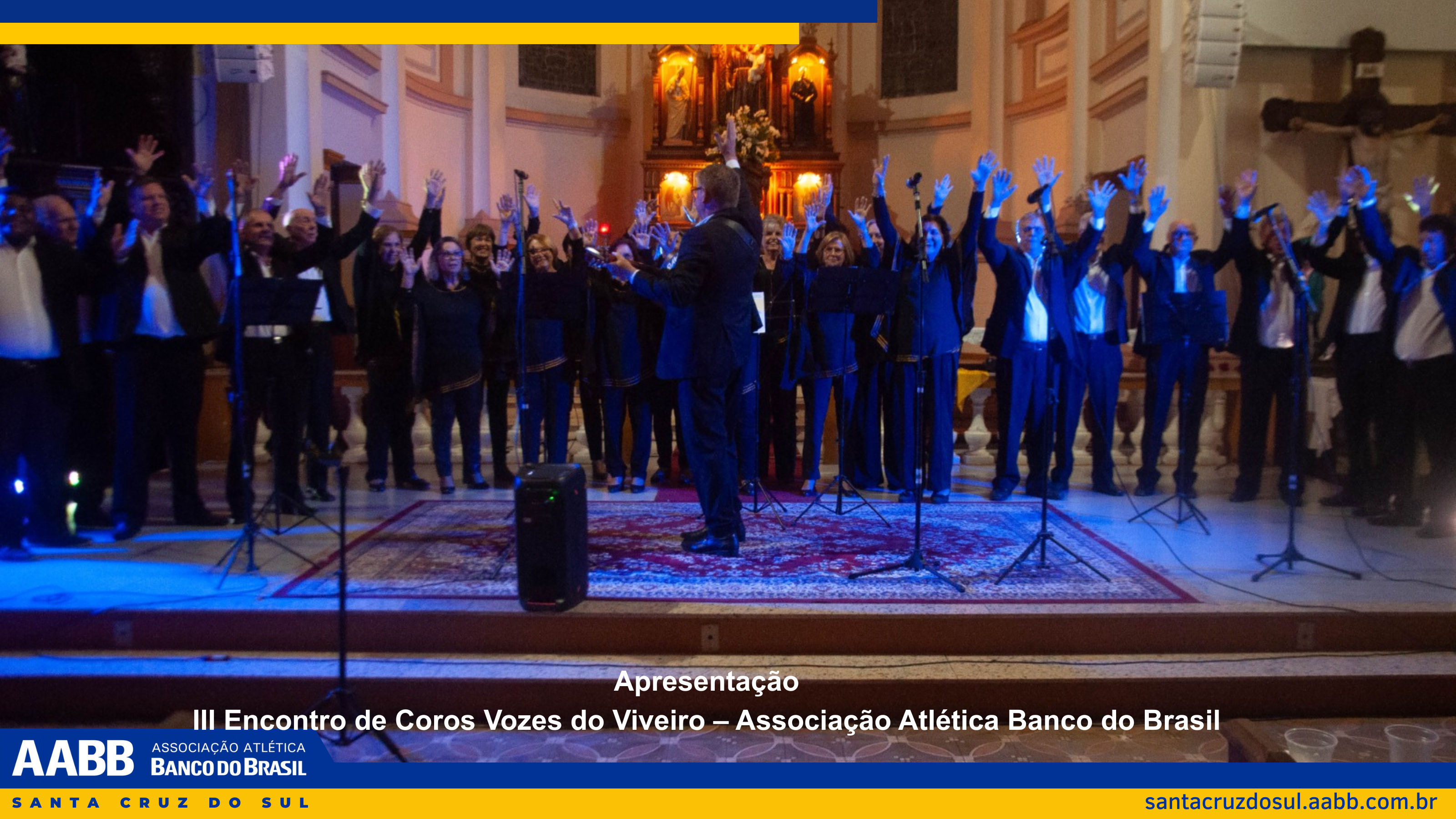 A primeira apresentação aconteceu no dia 18 de outubro, em Cachoeira do Sul, durante o III Encontro de Coros Vozes do Viveiro – Associação Atlética Banco do Brasil, realizado na Igreja Santo Antônio. O evento reuniu seis grupos: Coral Martim Lutero, Coral Municipal de Candelária, Coral CPERS em Canto, Coral Tom de Mulher, Coral Vozes do Viveiro (anfitrião) e o Coral da AABB Santa Cruz do Sul. O encerramento teve um momento especial, quando todos os coros se uniram para cantar “Meu Pago”, de Moacyr Cunha Rosing. O Coral da AABB apresentou as músicas Trem das Sete, Oceanos e Tocando em Frente.